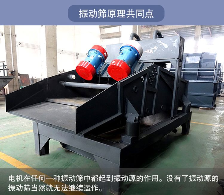 無論是哪種振動篩其結構中都少不了電機,這是因為電機在任何一種振動篩中都起到振動源的作用。沒有了振動源的振動篩當然就無法繼續(xù)運作。不同振動篩的原理共同之處就是振動電機接通電源后,電機上的偏心塊產生激振力,帶動整個篩框篩網的振動,物料在振動作用下與篩面做相互運動,小于篩孔大小的物料就會穿過篩網到達下一層級,而篩不下去的物料則通過振動篩出料口排出,以此類推,從而達到層層分級的效果。