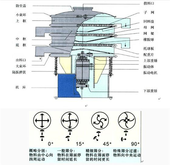 旋振篩是由直立式電機(jī)作激振源,電機(jī)上、下兩端安裝有偏心重錘,將電機(jī)的旋轉(zhuǎn)運(yùn)動(dòng)轉(zhuǎn)變?yōu)樗健⒋怪薄A斜的三次元運(yùn)動(dòng),再把這個(gè)運(yùn)動(dòng)傳遞給篩面。通過(guò)調(diào)節(jié)上、下兩端的相位角,可以改變物料在篩面上的運(yùn)動(dòng)軌跡,通過(guò)增減振動(dòng)電機(jī)上下兩端的偏心重錘配重塊重量可以增加和減少震動(dòng)幅度。