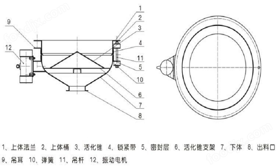 將振動(dòng)由機(jī)接通由源攝動(dòng)由機(jī)起振。且產(chǎn)生的激振力使給料斗下體在水平方向產(chǎn)生強(qiáng)列的振動(dòng)此振動(dòng)通過錐面或球面活化器將水平激振力分解為法向力和切向力法向力呈放射狀傳遞到物料深處切向力使物料受剪從而消除倉(cāng)內(nèi)物料的起拱使物料像流水一樣從出料口排出。切斷電源振動(dòng)電機(jī)停振排料可停止。