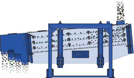 設(shè)備的篩箱在慣性力的作用下作前后往復(fù)運(yùn)動,并帶動篩面做周期性搖動,迫使篩面上的物料隨篩箱一同做定向跳躍式運(yùn)動,小于篩面孔徑的物料通過篩框落到下層,稱為篩下物,大于篩面孔徑的物料經(jīng)連續(xù)翻滾跳躍運(yùn)動后從排料口排出,完成篩分作業(yè)。