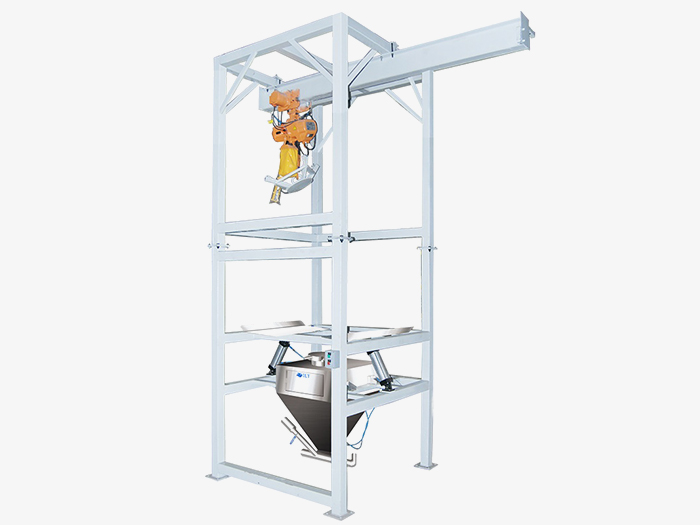 起重設(shè)備:自身攜的帶起重設(shè)備將大袋(噸袋)吊裝到卸料機的機架上,不需用外界的幫助。