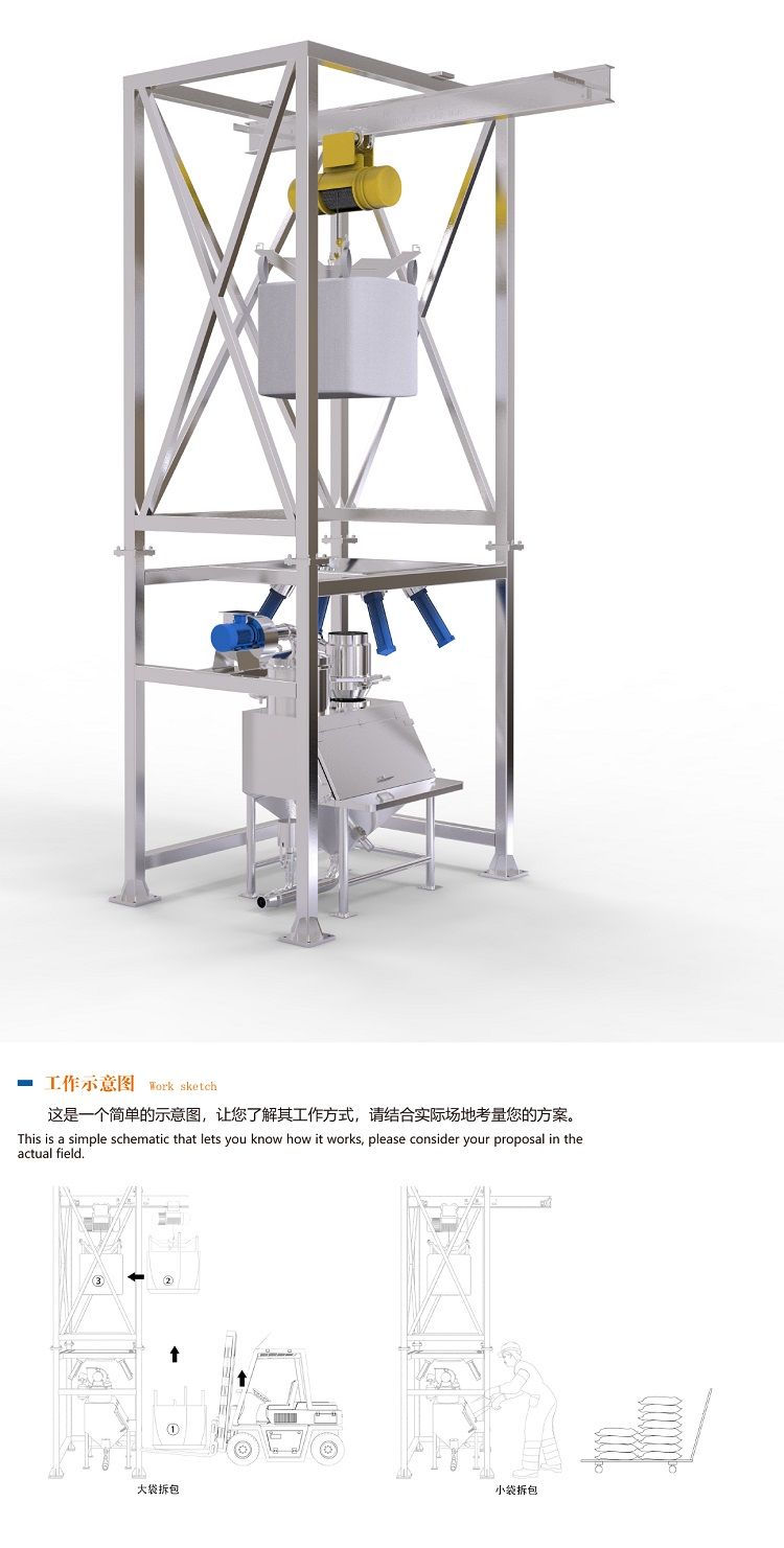 結(jié)構(gòu):噸袋卸料投料站用于噸袋裝粉狀、顆粒狀物料拆包卸料作業(yè)。該設(shè)備由機架、提升裝置、隔膜閥、暫存料倉等組成;根據(jù)工藝特點和設(shè)備尺寸,可以采用吊機和叉車兩種不同的方式; 可配有雙軌道,用于兩只電動葫蘆安裝的場合中,提高拆袋效率;材質(zhì)分為碳鋼和不銹鋼兩種;整套設(shè)備密封性好,操作簡便,極大的提高了生產(chǎn)環(huán)境和生產(chǎn)效率。