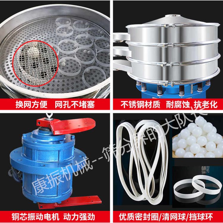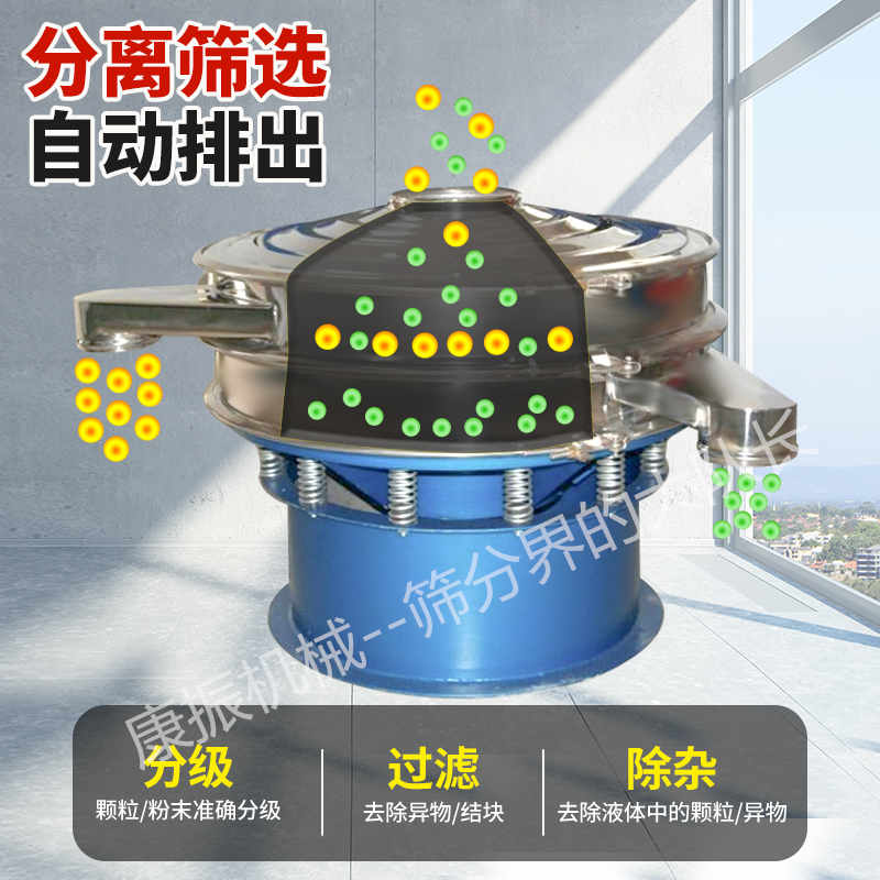任何顆粒、粉末、粘液一定范圍內(nèi)均可篩選。篩分細(xì)至500目或0.028mm, 過濾小可至5微米。分級篩選,可篩一至五層篩網(wǎng),能同時進(jìn)行二至六個等級的分選或過濾。